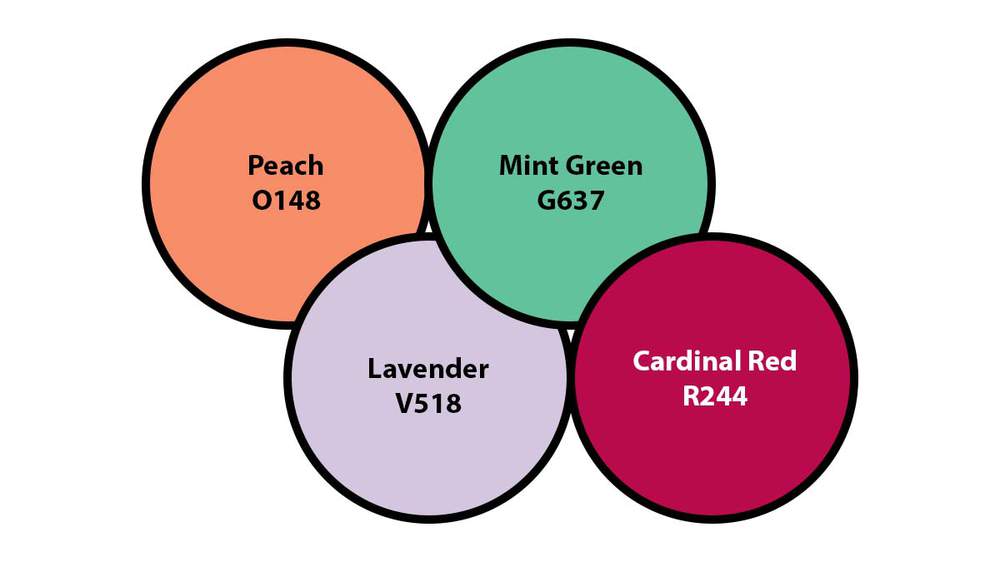 Peach (O148), Lavender (V518), Mint Green (G637), Cardinal Red (R244)