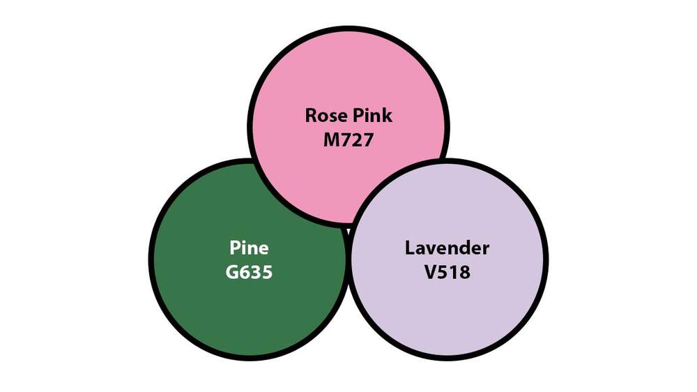 Pine (G635), Rose Pink (M727), Lavender (V518)