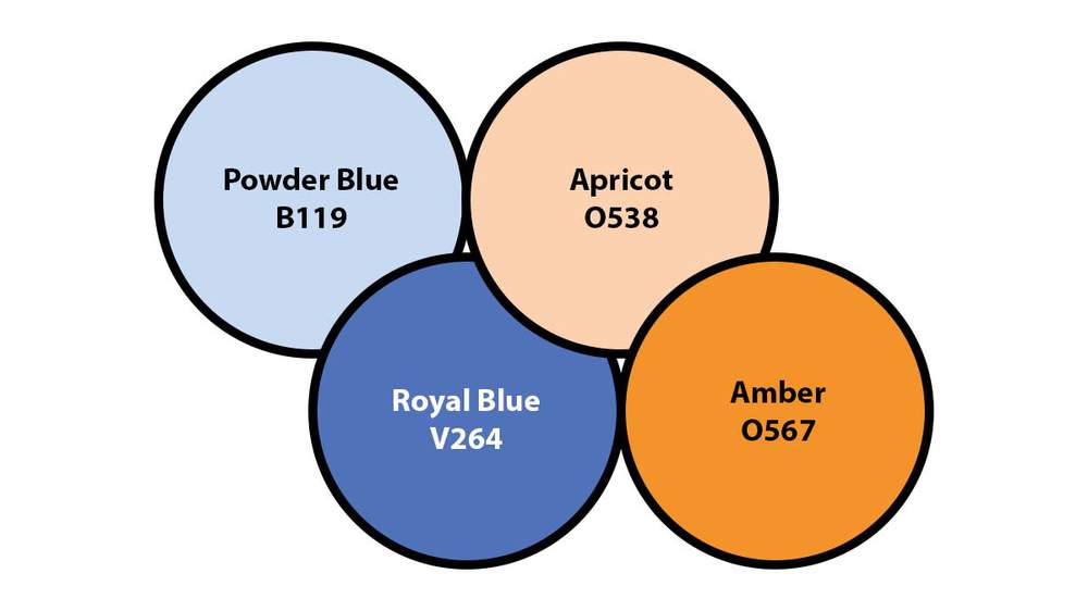 Powder Blue (B119), Royal Blue (V264), Apricot (O538), Amber (O567)