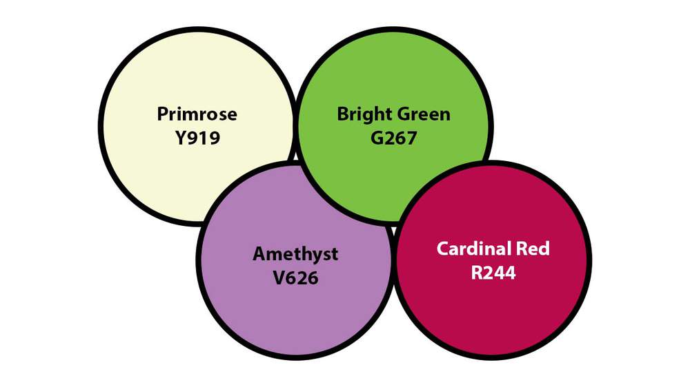 Primrose (Y919), Amethyst (V626), Bright Green (G267), Cardinal Red (R244)