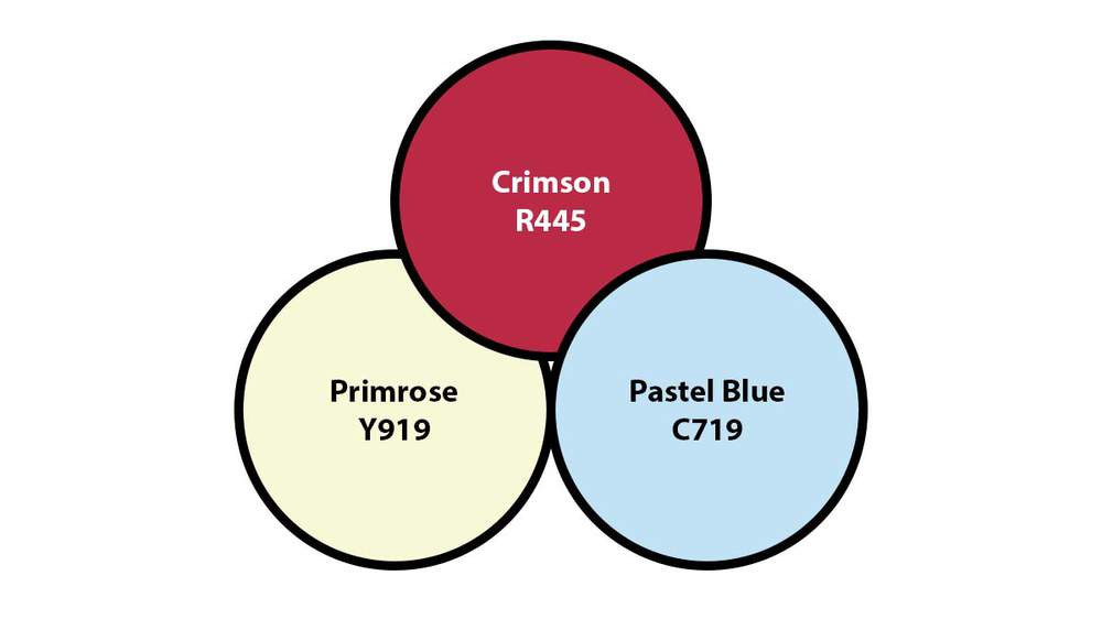 Primrose (Y919), Crimson (R445), Pastel Blue (C719)