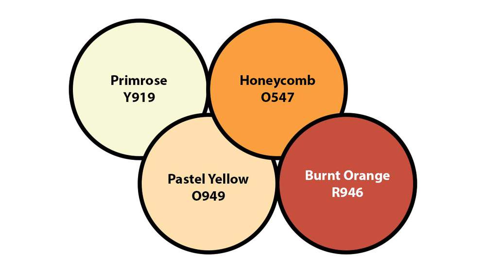 Primrose (Y919) → Pastel Yellow (O949) → Honeycomb (O547) → Burnt Orange (R946)
