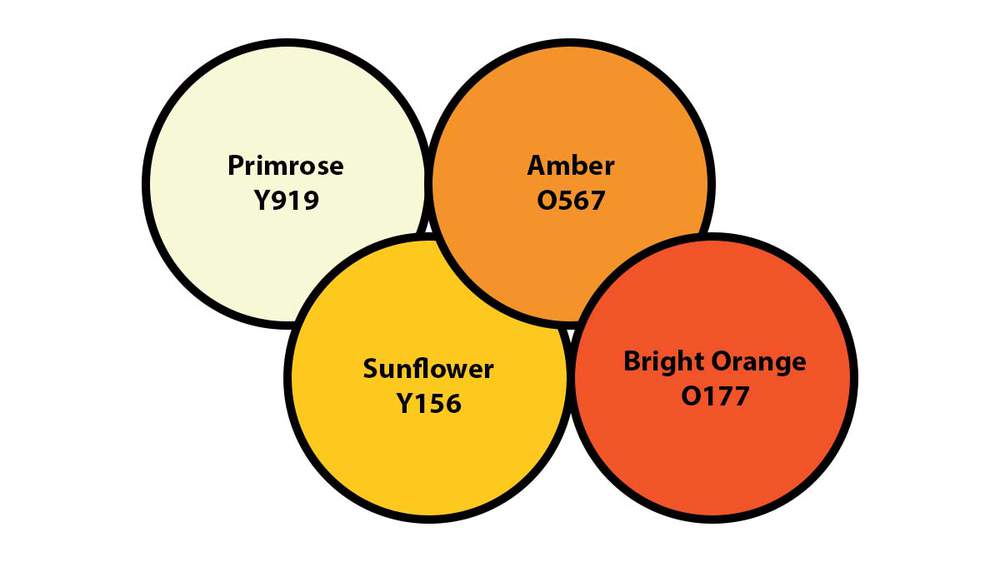 Primrose (Y919) → Sunflower (Y156) → Amber (O567) → Bright Orange (O177)