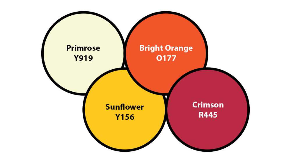 Primrose (Y919) → Sunflower (Y156) → Bright Orange (O177) → Crimson (R445)