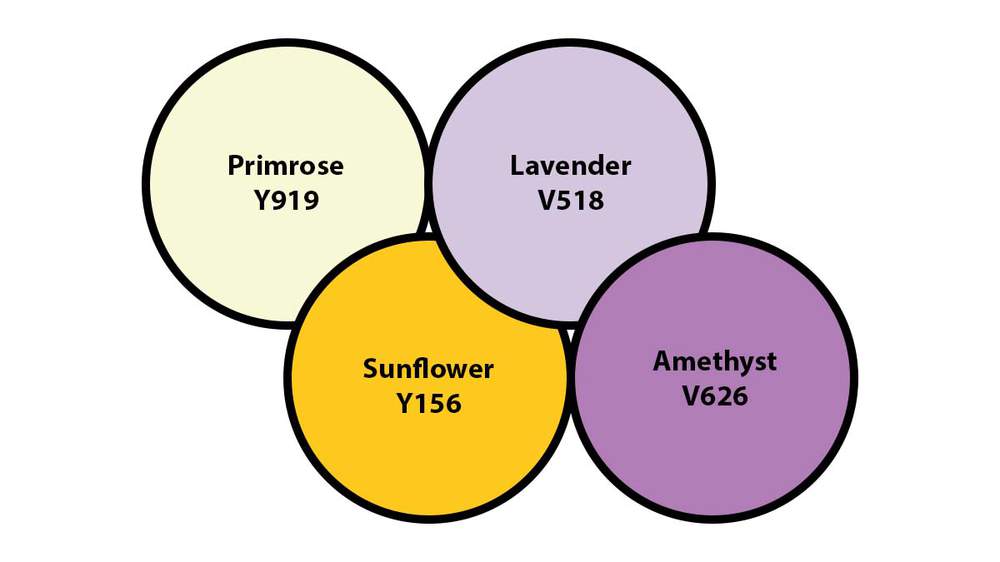 Primrose (Y919), Sunflower (Y156), Lavender (V518), Amethyst (V626)