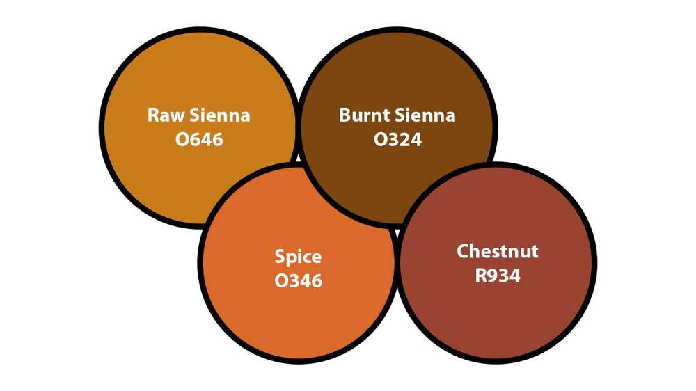 Raw Sienna (O646) → Spice (O346) → Burnt Sienna (O324) → Chestnut (R934)