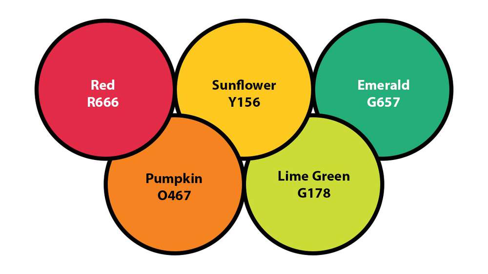 Red (R666) → Pumpkin (O467) → Sunflower (Y156) → Lime Green (G178) → Emerald (G657)