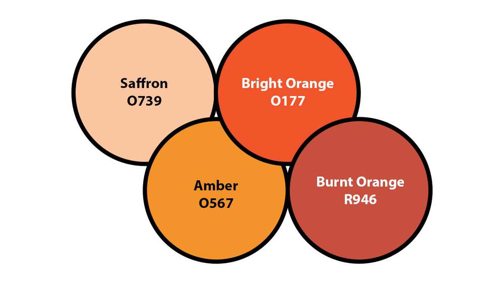 Saffron (O739) → Amber (O567) → Bright Orange (O177) → Burnt Orange (R946)