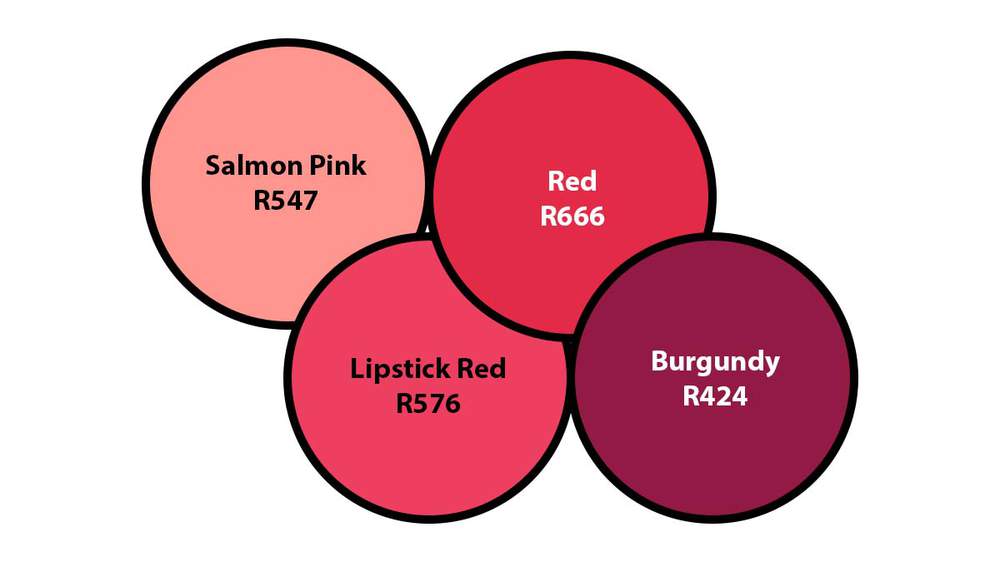 Salmon Pink (R547) → Lipstick Red (R576) → Red (R666) → Burgundy (R424)
