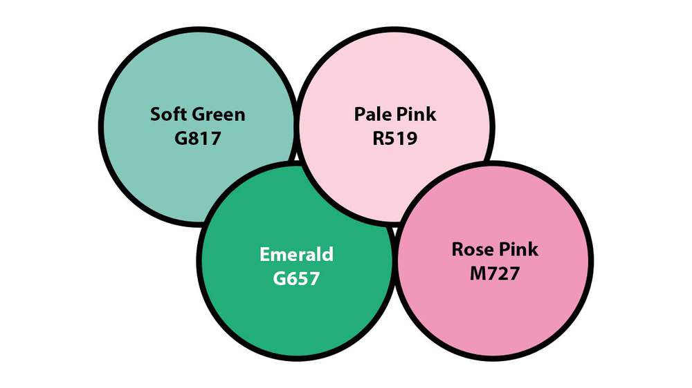 Soft Green (G817), Emerald (G657), Pale Pink (R519), Rose Pink (M727)