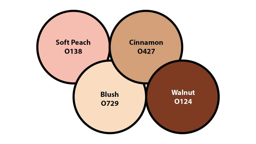 Soft Peach (O138) → Blush (O729) → Cinnamon (O427) → Walnut (O124)