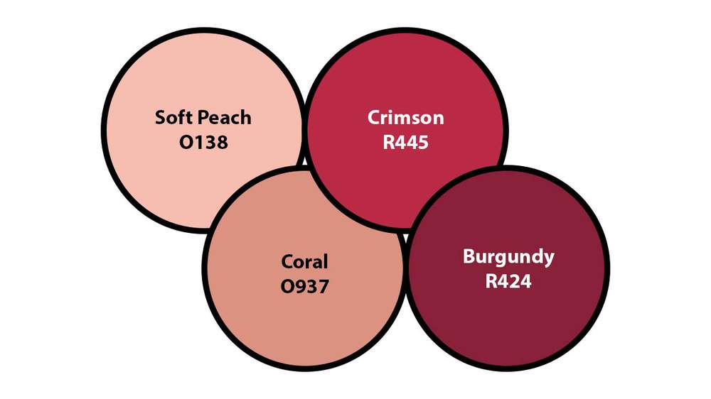 Soft Peach (O138) → Coral (R937) → Crimson (R445) → Burgundy (R424)
