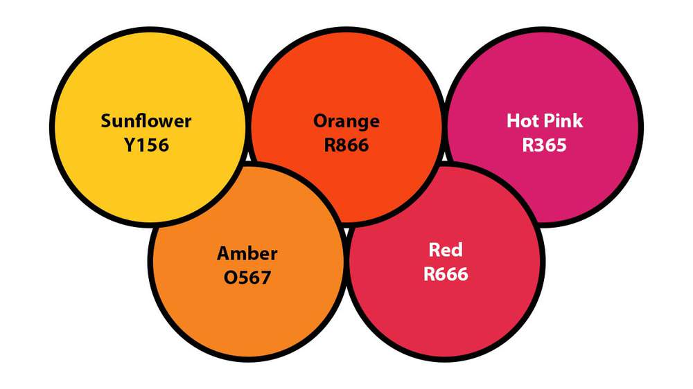 Sunflower (Y156) → Amber (O567) → Orange (R866) → Red (R666) → Hot Pink (R365)