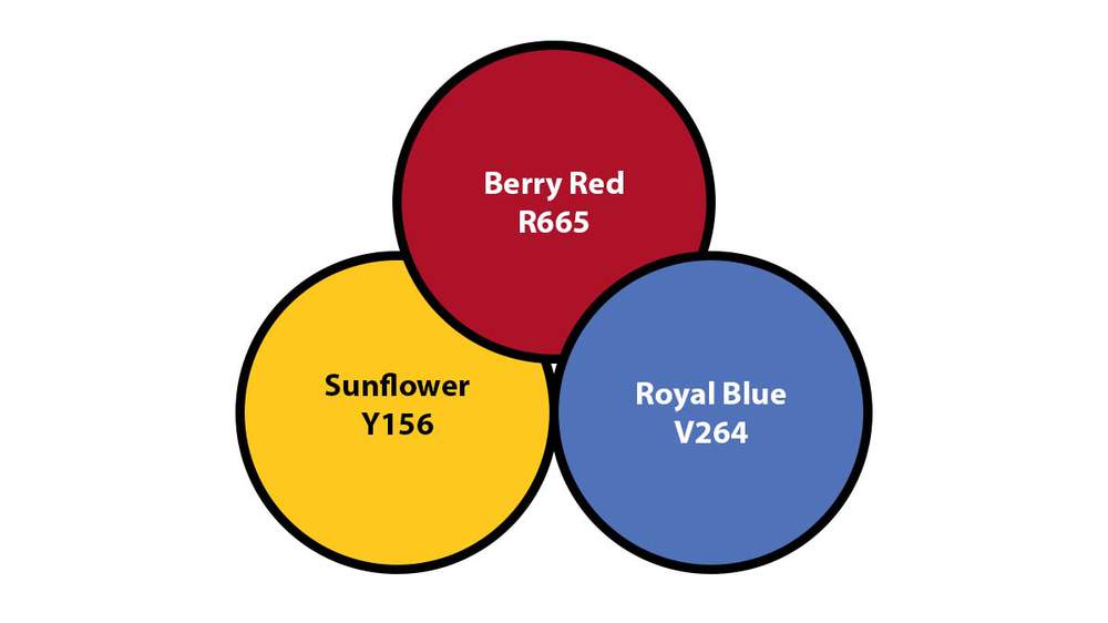 Sunflower (Y156), Berry Red (R665), Royal Blue (V264)