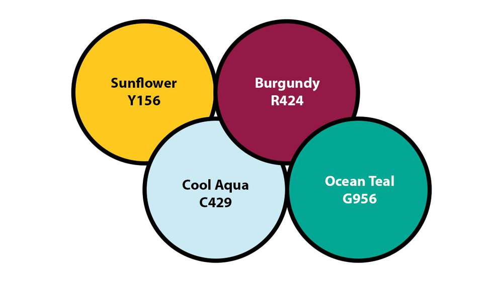Sunflower (Y156), Cool Aqua (C429), Burgundy (R424), Ocean Teal (G956)