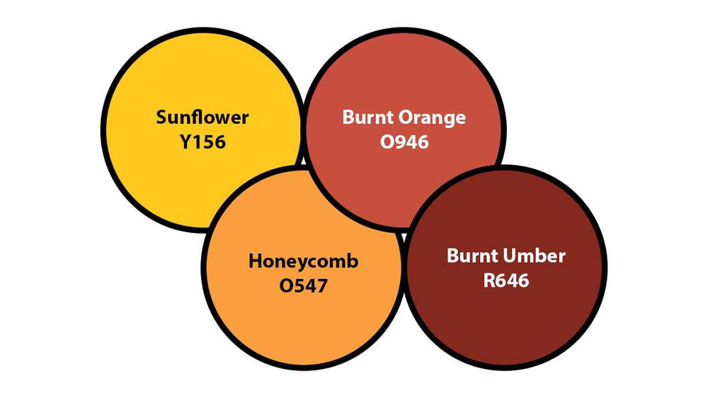 Sunflower (Y156) → Honeycomb (O547) → Burnt Orange (R946) → Burnt Umber (R646)