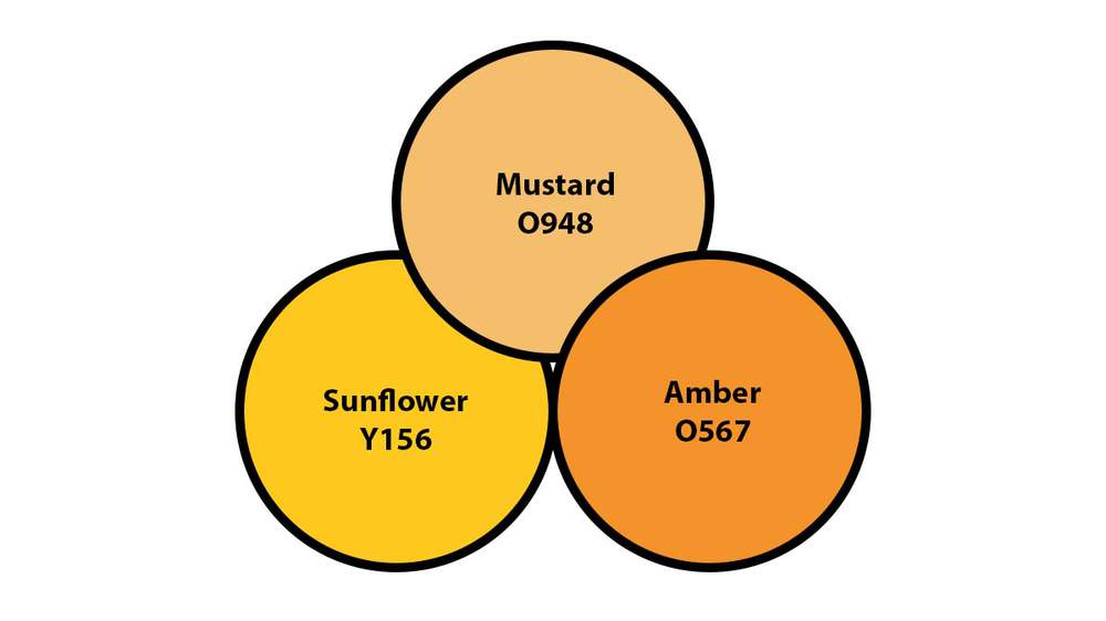 Sunflower (Y156), Mustard (O948), Amber (O567)