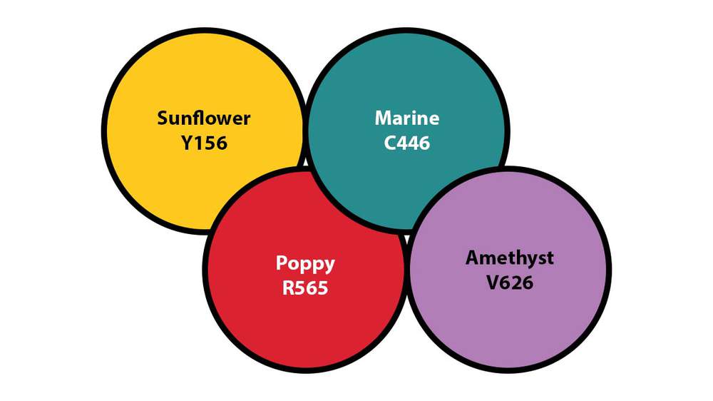 Sunflower (Y156), Poppy (R565), Marine (C446), Amethyst (V626)