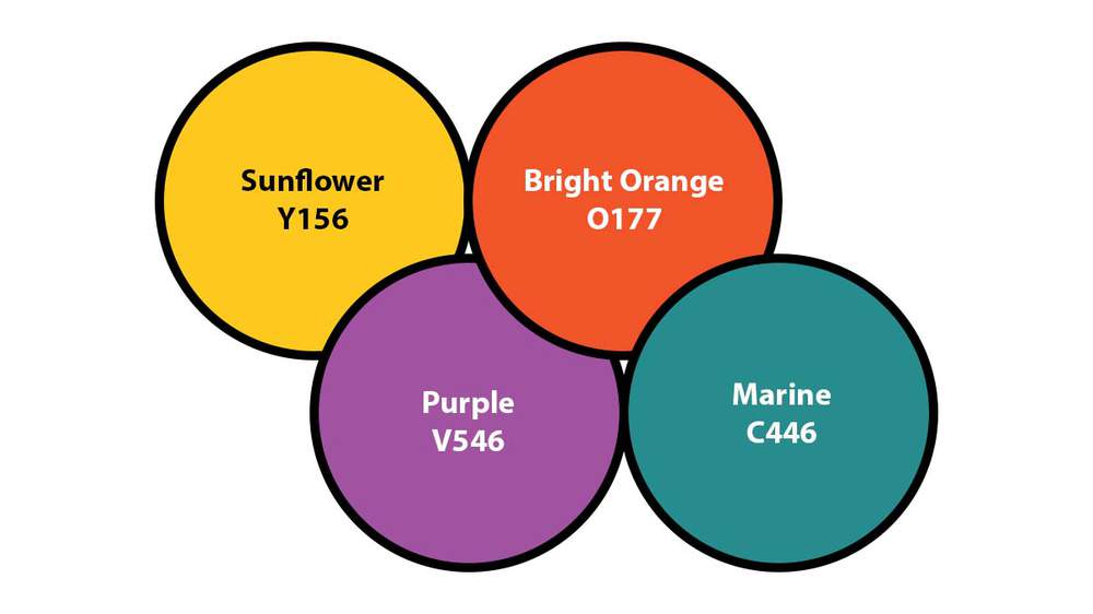 Sunflower (Y156), Purple (V546), Bright Orange (O177), Marine (C446)