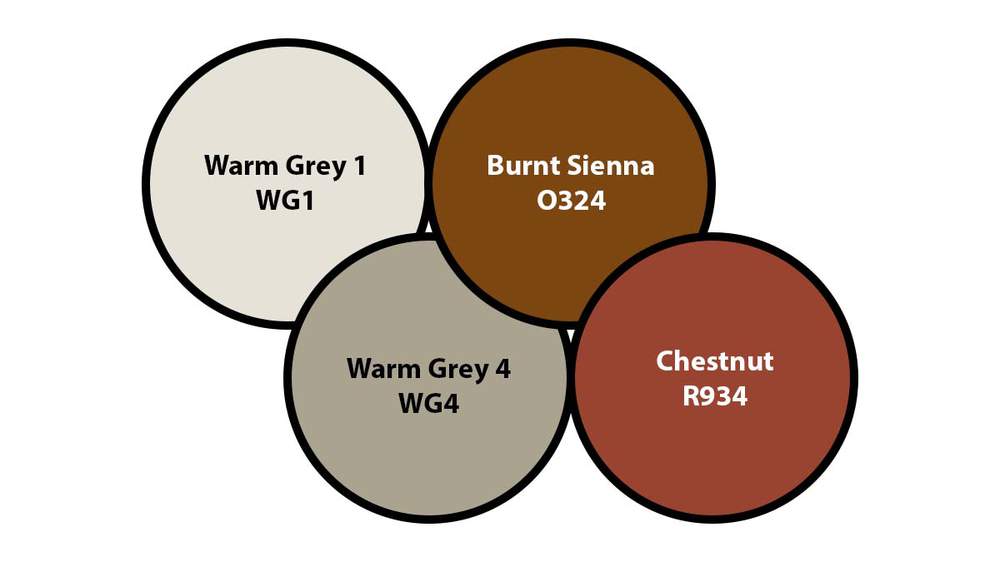 Warm Grey 1 (WG1) → Warm Grey 4 (WG4) → Burnt Sienna (O324) → Chestnut (R934)