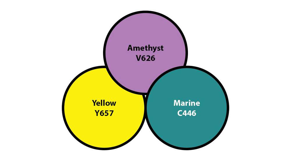 Yellow (Y657), Amethyst (V626), Marine (C446)