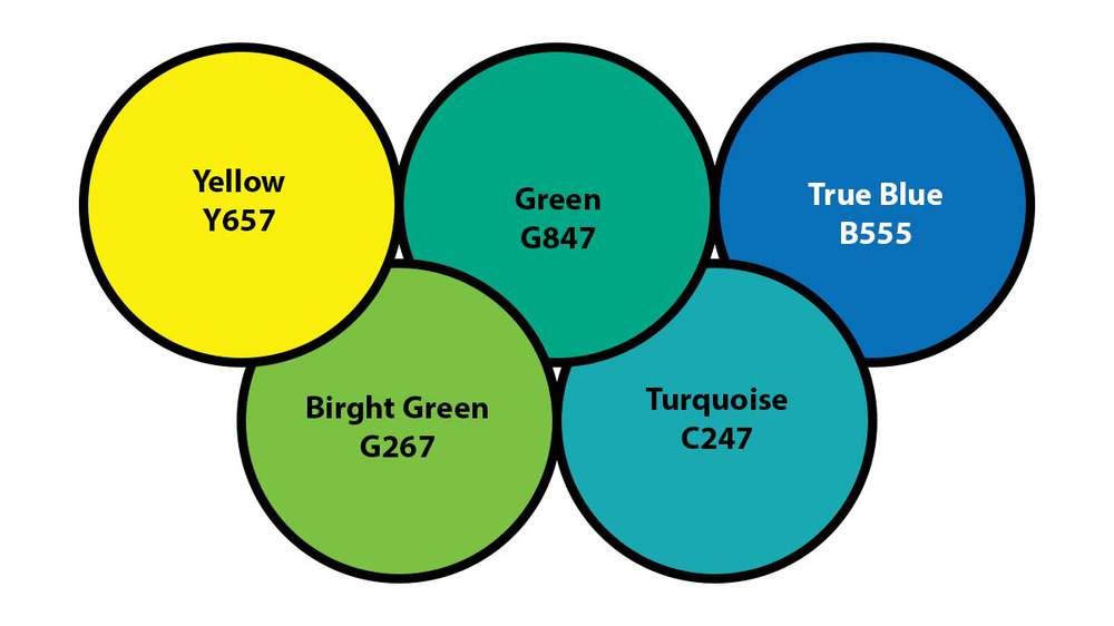 Yellow (Y657) → Bright Green (G267) → Green (G847) → Turquoise (C247) → True Blue (B555)