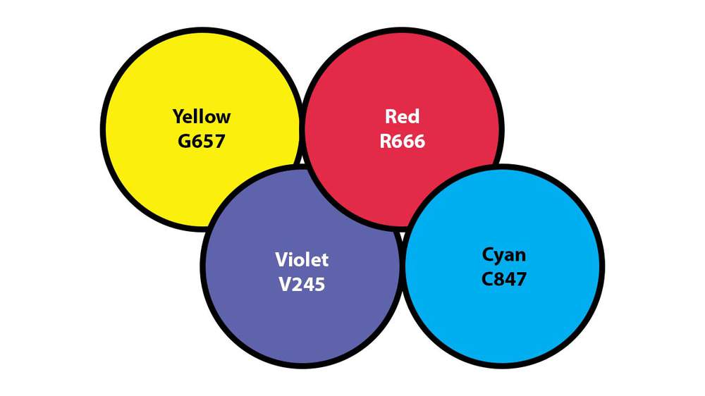 Yellow (Y657), Violet (V245), Red (R666), Cyan (C847)