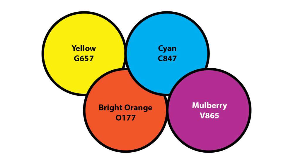 Yellow (Y657), Bright Orange (O177), Cyan (C847), Mulberry (V865)